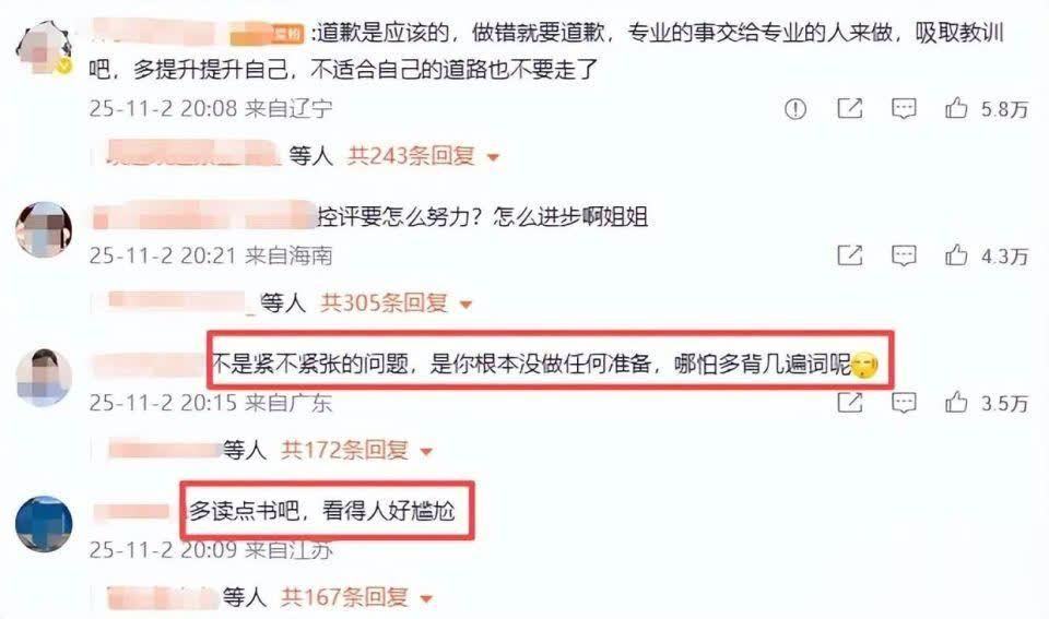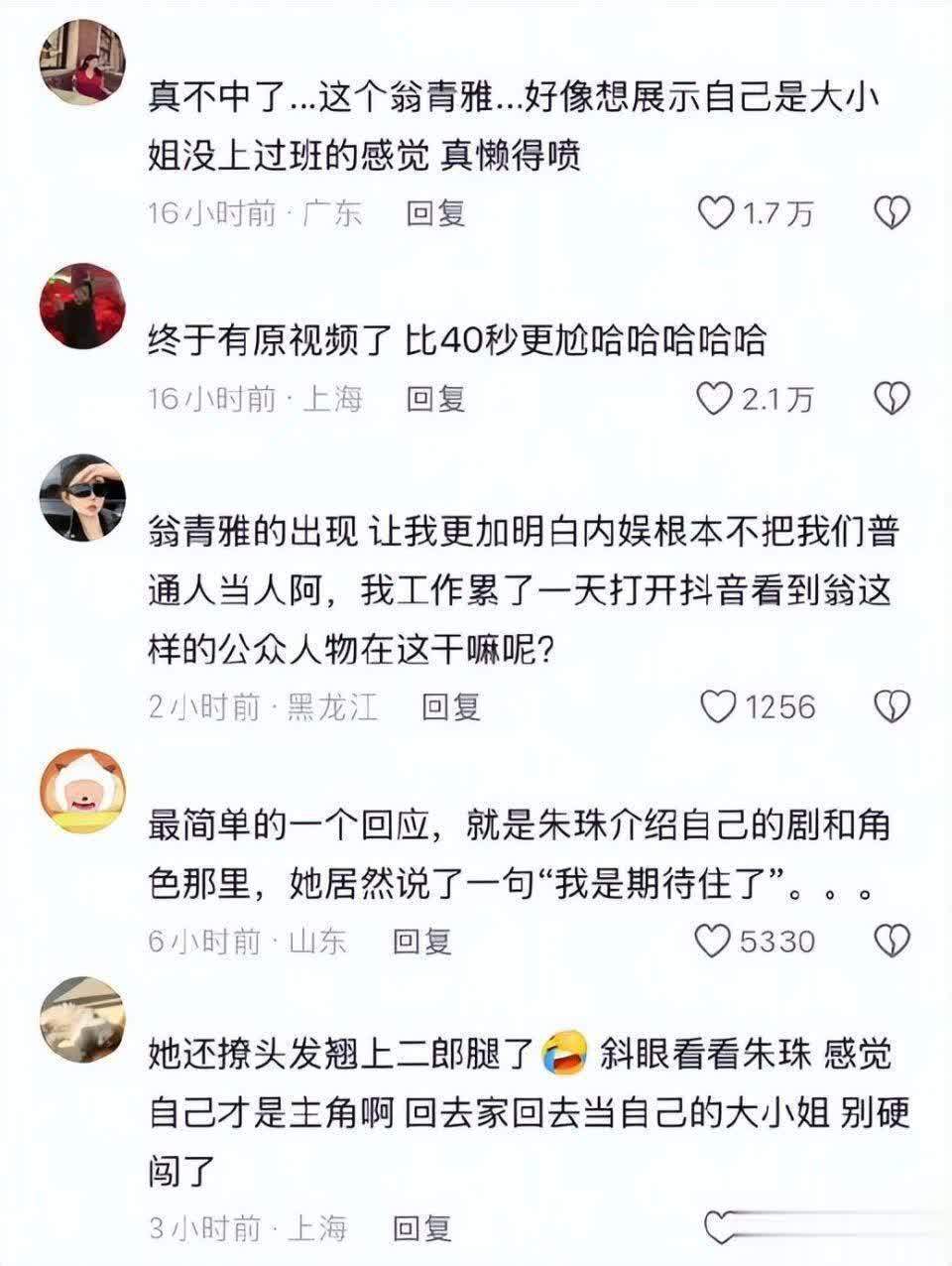 在网友们看来,翁青雅作为一个公众人物,拥有着令人羡慕的资源和机会,就应该承担起相应的责任,展现出与之匹配的专业素养和职业态度。她的这次采访,不仅仅代表着她个人,还关乎到整个行业的形象 。可她却如此不珍惜这次机会,在采访前没有做好充分的准备,对嘉宾缺乏最基本的尊重,在采访中又状况百出,严重影响了观众的观看体验。这种行为,是对观众的不尊重,也是对这份工作的亵渎 。所以,即便她选择了道歉,网友们也难以再对她宽容以待,纷纷在评论区留言,表达着自己的不满和失望,让她好好反思自己的行为,提升自己的能力。