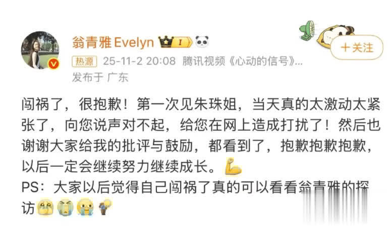 随着舆论的持续发酵,翁青雅终于意识到了事态的严重性,于 11 月 2 日在社交平台上发表了道歉声明 。她在文中写道:“闯祸了,很抱歉!第一次见朱珠姐,当天真的太激动太紧张了,向您说声对不起,给您在网上造成打扰了!然后也谢谢大家给我的批评与鼓励,都看到了,抱歉抱歉抱歉,以后一定会继续努力继续成长 。PS:大家以后觉得自己闯祸了真的可以看看翁青雅的探访。” 从道歉内容来看,她将采访中的种种失误归咎于 “太激动太紧张”,试图以此来获取大家的谅解。